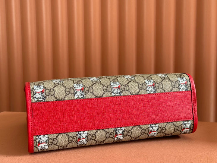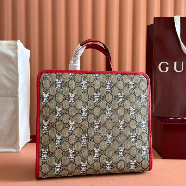 CHILDREN'S PRINTED CAT TOTE BAG 28.5 IN BEIGE AND DARK BROWN GG CANVAS RED TRIM