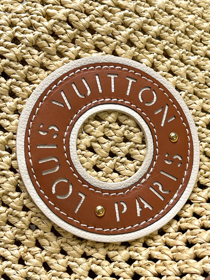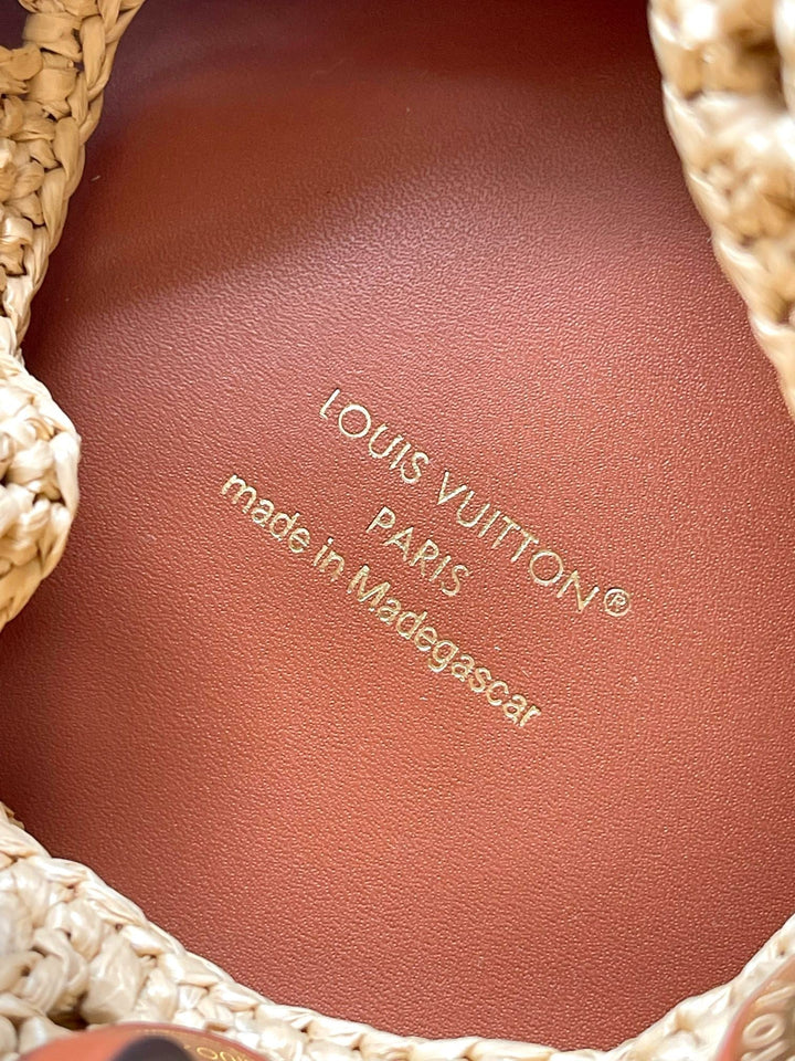 ?Material: Crocheted raffia and calfskin trim